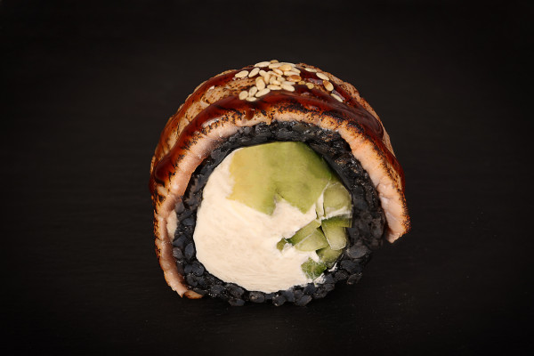 Czarny ryż, ser Cremette, ogórek, awokado, łosoś przypalany od góry, sos unagi, sezam