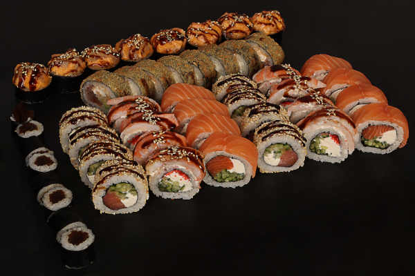 Philadelphia łosoś,Florida,Deluxe wędzony łosoś ,Futomaki tempura z tuńczykiem i awokado, Hosomaki z Kanpyo,Futomaki pieczone z łososiem (48 szt)