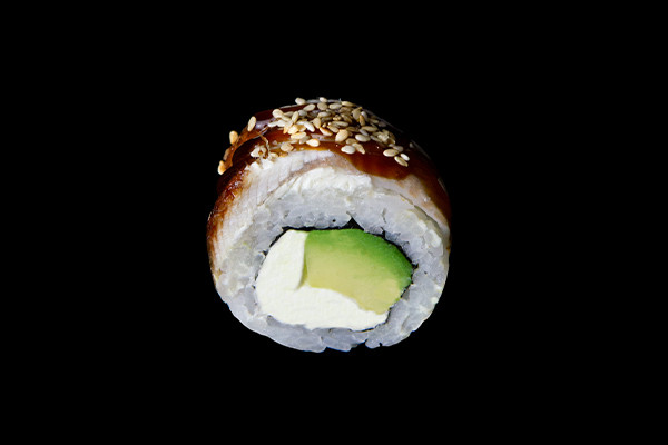 Wegorz unagi od gory, ser twarogowy, sos unagi,awokado ,Sezam
