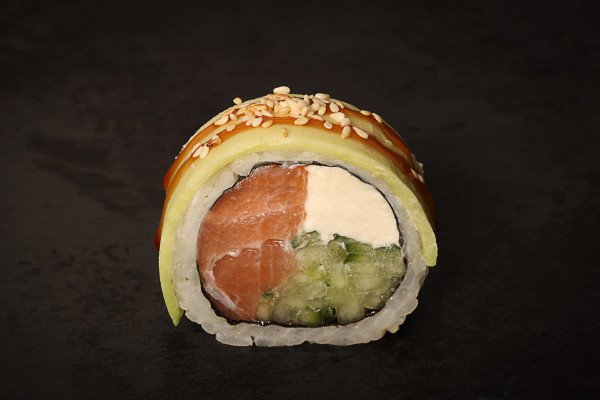 łosoś ,ser Cremette, ogórek, awokado od góry ,sos unagi ,sezam