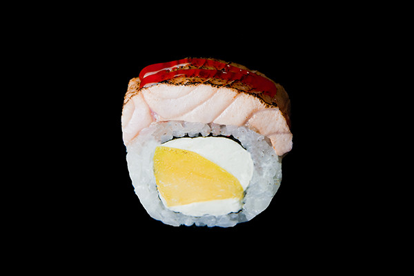 ser Cremette,mango, łosoś przypalany od góry, sos mango