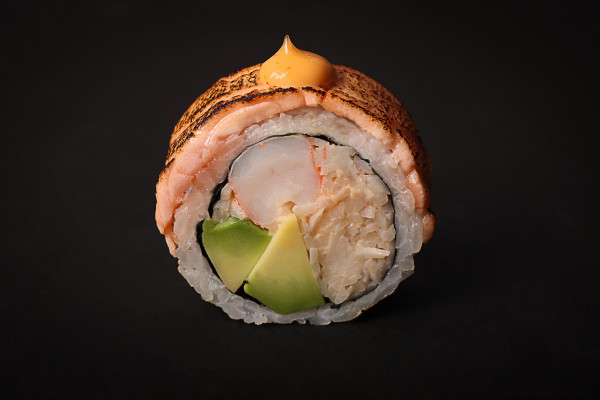 łosoś przypalany od góry. krab śnieżny. Krewetki, awokado. spicy sos